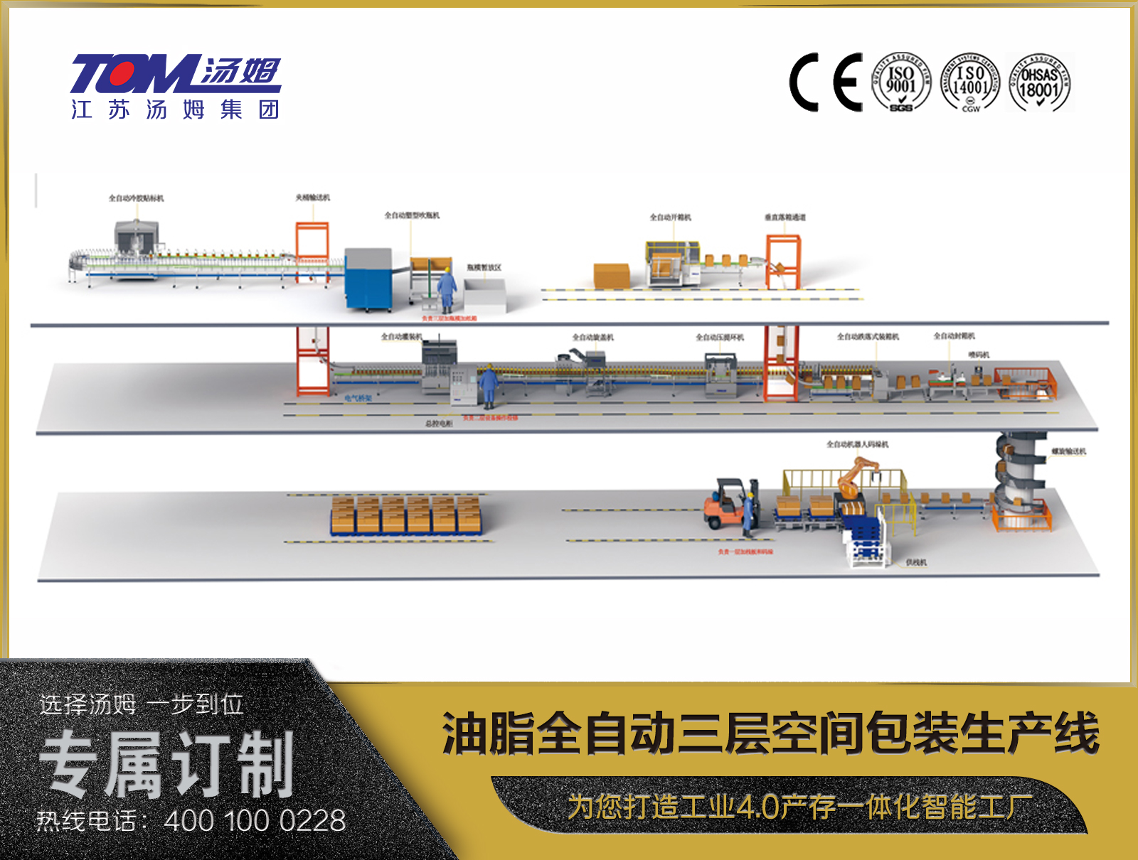 江蘇湯姆森智能裝備有限公司 是江蘇湯姆集團(tuán)旗下全資子公司,坐落于常州市金壇區(qū)儒林鎮(zhèn)99號(hào),是專(zhuān)業(yè)生產(chǎn)農(nóng)化、日化、潤(rùn)滑油、涂料、化工、調(diào)味品、鋰電新材料智能包裝裝備的廠(chǎng)家,工廠(chǎng)占地150畝,建筑面積120558㎡,擁有員工800多人,博士生2名,碩士研究生30名,本科358名,目前已取得ISO9001質(zhì)量體系認(rèn)證、ISO14001環(huán)境管理體系認(rèn)證、OHSAS18001職業(yè)健康安全體系認(rèn)證、CE認(rèn)證。26年來(lái),經(jīng)過(guò)湯姆人的艱苦奮斗,湯姆集團(tuán)不斷創(chuàng)新發(fā)展、與時(shí)俱進(jìn),為4000多家企業(yè)提供了一代又一代先進(jìn)的智能包裝設(shè)備,為客戶(hù)打造工業(yè)4.0智能化工廠(chǎng);為客戶(hù)提供自動(dòng)化立體倉(cāng)庫(kù);為客戶(hù)創(chuàng)建智慧工廠(chǎng)生產(chǎn)數(shù)據(jù)采集執(zhí)行系統(tǒng)(MES)。 了解更多>>