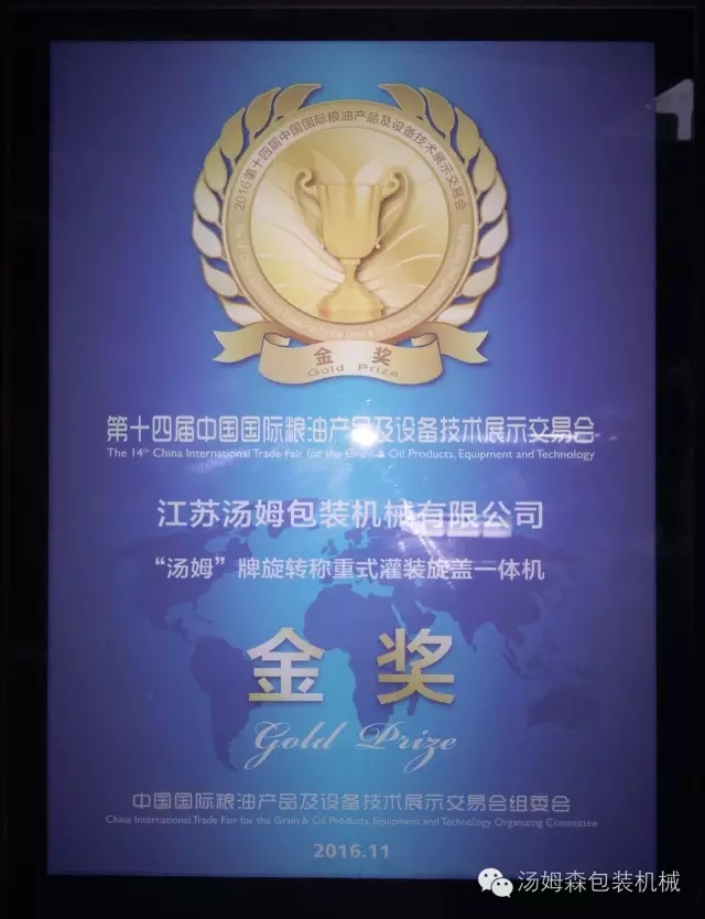 在11月6日閉幕的第十四屆中國國際糧油產(chǎn)品及設(shè)備技術(shù)展示交易會上,江蘇湯姆集團“旋轉(zhuǎn)稱重式灌裝旋蓋一體機”喜獲金獎。