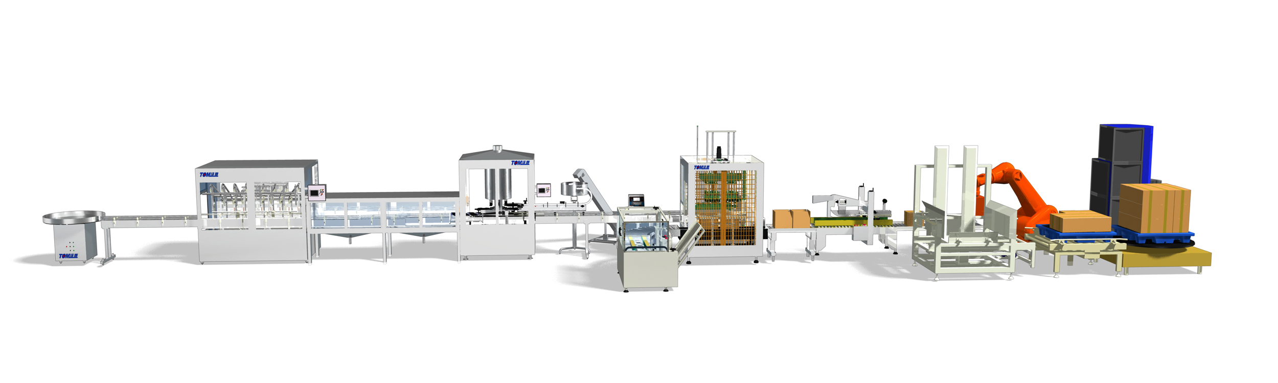此條生產(chǎn)線設(shè)備配置:進桶機、全自動稱重式灌裝機、全自動封蓋機、噴碼機、開箱機、裝箱機、封箱機、機器人碼垛機、自動捆扎與纏繞機。